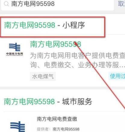 在发现页面找到小程序,点击一下。在弹出的搜索框输入南方电网。