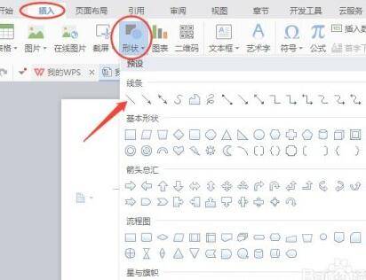如果觉得输入三个减号再按回车键比较麻烦,也可以打开插入菜单,在下面找到形状命令,在下拉菜单中找到并单击选择线条中的直线。
