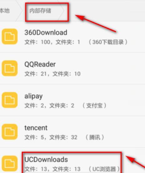 6、在内部存储项下有多个文件或文件夹,查找下载文件所用软件的同名文件夹即可。如文件在UC浏览器下载的,则点击打开“UCDownloads”文件夹。