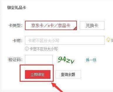 4、在打开的礼品卡界面中,输入礼品卡的密码以及验证码,完成后点击“立即绑定”。