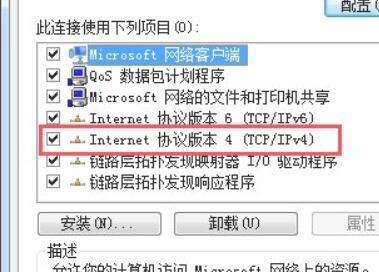 点击属性功能选项,进入无线网络连接属性窗口,找到internet协议标准4(TCP/IPV4)选项。
