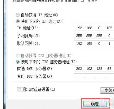 选定使用下面的IP地址,然后按要求输入要设置的固定IP地址和DNS,设置完成后点击确定按钮,固定IP就设置完成了。