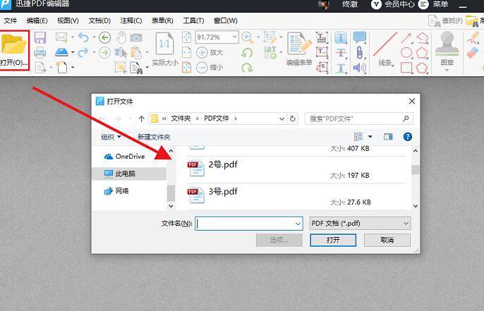 PDF编辑器的功能界面弹出之后,在页面左上角点击“打开”。接着弹出一个“打开文件”的对话框,将需要打开的pdf文件选择一下,点击“打开”即可成功添加文件。
