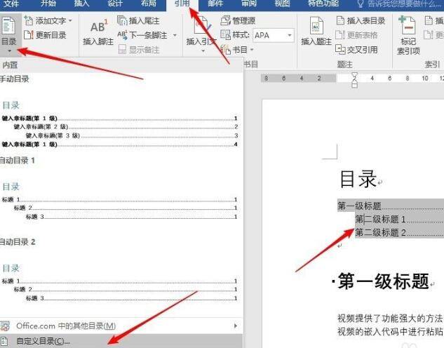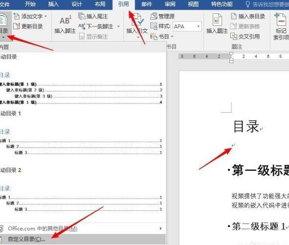 将光标置于页面顶端,点击引用—目录—自定义目录。