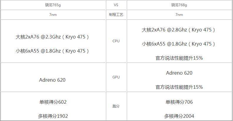 骁龙768G是官方超频版的骁龙765G。骁龙768G跟骁龙765G多采用了三星7nm EUV工艺、完全相同的Kryo 475 CPU架构以及Adreno 620 GPU。不过将CPU主频从2.3Ghz提高了2.8Ghz,GPU主频也提升到了750Mhz。