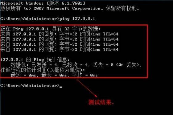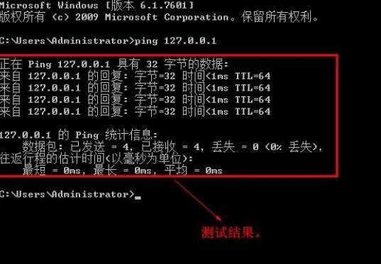 5、ping命令输入完毕后敲击回车键,界面会显示测试结果。