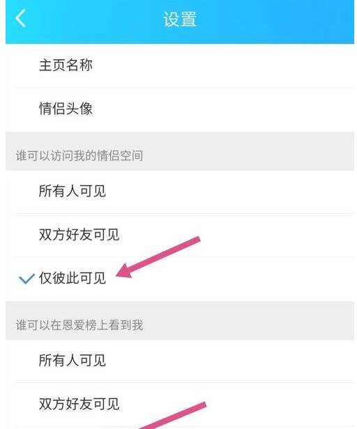 进入设置,访问我的情侣空间、恩爱榜看到我,都设置成仅彼此可见即可。