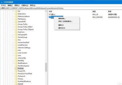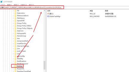 3、依次进入“HKEY_CURRENT_USERSoftwareMicrosoftWindowsCurrentVersionPolicies”。