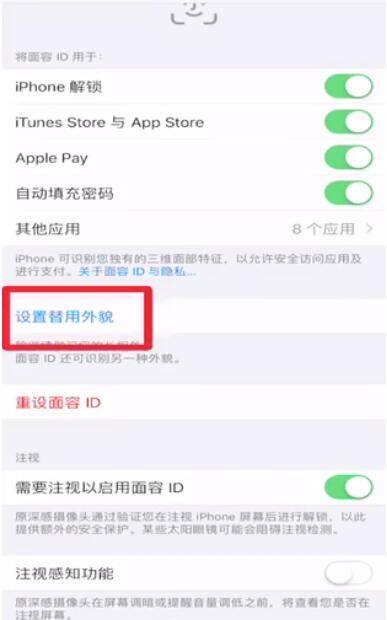 进入后检查面容ID设置是否已经开启,尝试开关按钮,点击“设置替用外貌即可”。