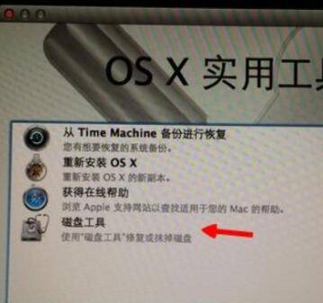 在OS X实用工具界面中选择磁盘工具,抹掉磁盘上的储存记录。