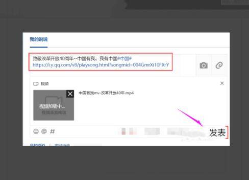 点击链接符号,选择音乐选项按钮,输入自己想要插入的音频文件,点击“发表”按钮即可。