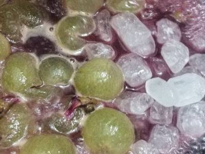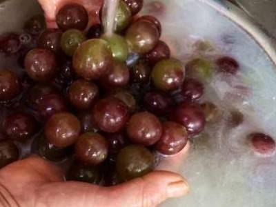 2、葡萄粒内加入两勺面粉、一勺盐,用水清洗一下,清洗的时候要左右转一下圈。清洗干净后,捞入篮子沥干水分。