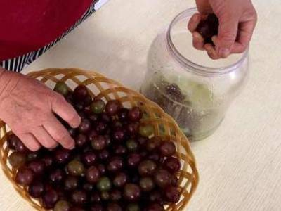3、取一个无水无油的瓶子,把葡萄粒用手捏碎,放入瓶里。瓶口上盖上一层保鲜膜,拧紧盖子,放到阴凉处,发酵40天。