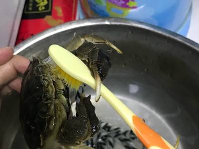 2、抓住螃蟹的两边,用牙刷用力清洗背、腹和嘴部,同时清洗螃蟹的两侧及脚和钳的根部。
