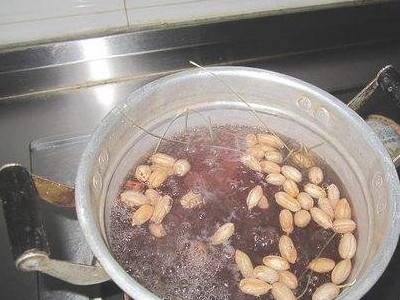 2、烧开水,煮沸之后加入花生、粉条和豆腐皮。