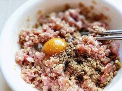 2、将切好的姜蒜末、料酒、生抽、蚝油、胡椒粉、一只鸡蛋、红糖放入肉糜中。