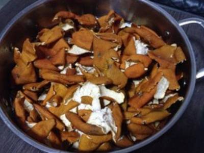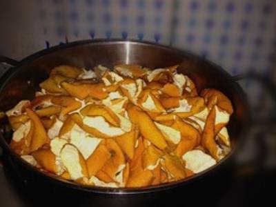 3、晒干的桔子皮放入蒸锅,水开后蒸约10分钟,蒸透的桔子皮再次晒干。