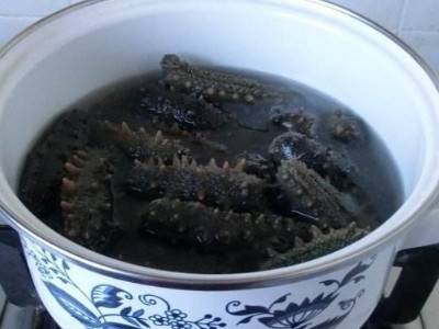 4、锅中加入纯净水煮沸后,加入海参用中火煮40-60分钟,煮至海参能轻轻掐透即可。