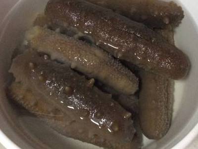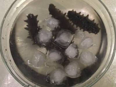 5、将海参放入0-5度冷纯净水中,泡24-36小时左右,期间每隔8小时换一次水,共换水2次,直至发泡到干海参2倍左右长度即可。