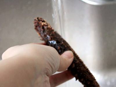 1、将干海参用自来水冲洗1分钟,洗去表面的灰尘杂物。