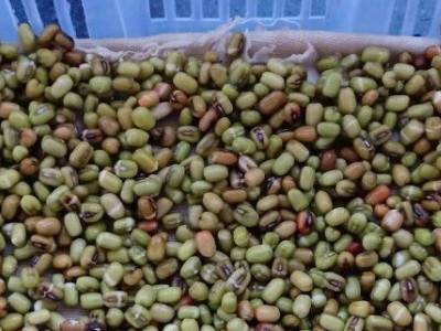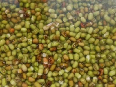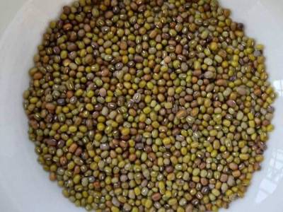 1、首先把绿豆倒入碗中,挑一些颗粒饱满的好豆子;