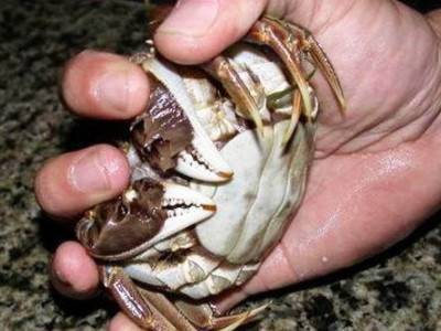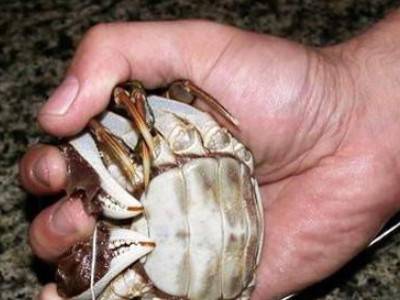 1、将蟹用手掌压在台上,用拇指跟尾指同无名指码住蟹的爪。再用食指跟中指按住蟹的两个大钳子。