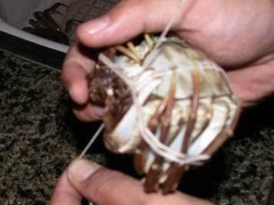 4、将蟹背朝上放下,两手同时一起打结,用剪刀剪去剩余线,蟹便捆好。