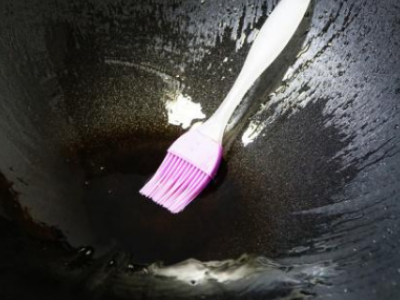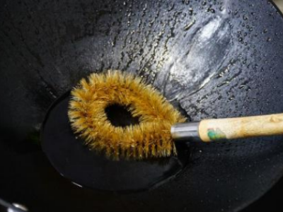 6、冲洗干净,用小火继续烤干,涂抹一层大豆油或者花生油,放置一夜,再炒菜时便不会粘锅。