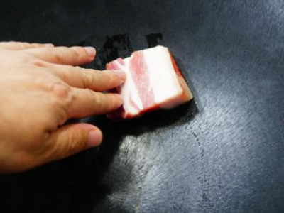 3、保持小火,找一块肥点的五花肉或者肥肉,在锅内旋转涂抹整个锅的内部,这个过程至少需要持续3-5分钟,肥肉变黑变焦。