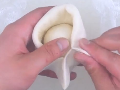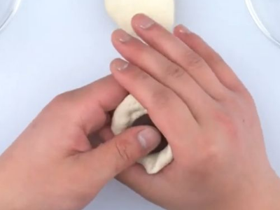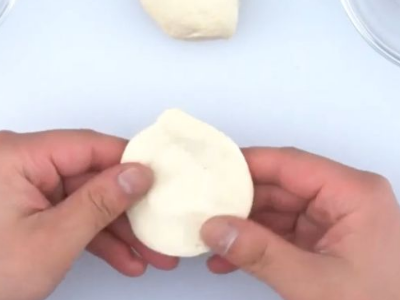 2、捏出适量豆沙,放在面饼上,面饼包裹豆沙。