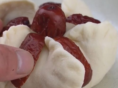 4、面团捏出五个角,把切好的红枣放在面团上装饰即可。