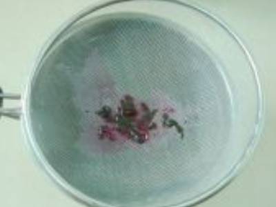 3、将挤出来苋菜汁过筛一次,滤去碎菜叶。