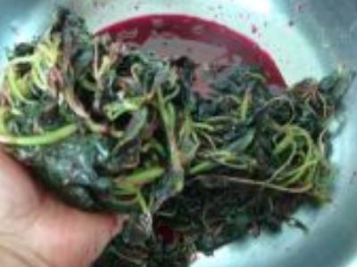 2、将放凉的红苋菜用手捏挤出菜汁。菜汁用来熬色素,苋菜可以用来凉拌。