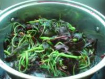 1、先将红苋菜择去老茎叶后清洗干净,放锅里,用少量的水翻炒熟后放凉。