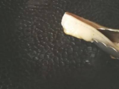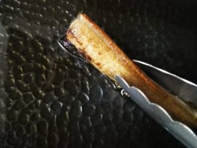 锅放回火上,继续用肥肉擦锅,螺旋式的再擦一遍,这样重复2-3遍,直到擦出来的油不是黑的即可。
