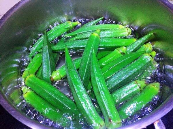 3、把秋葵放进沸水里煮五分钟。