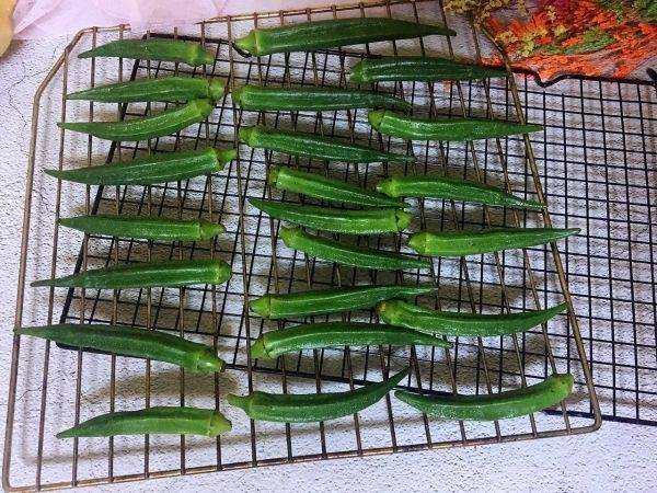 5、将秋葵码在烤网上。放入提前预热的烤箱,中层一百度热风循环烤一个半小时。