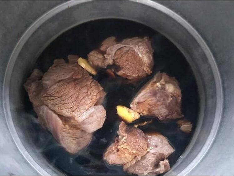 3、将牛肉和布袋放入高压锅中,加入料酒,生姜、盐、生抽和水,压十五分钟。