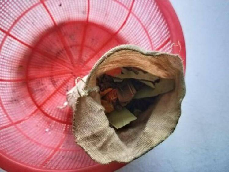 2、取花椒、香叶、桂皮、八角、干辣椒装在布袋里。