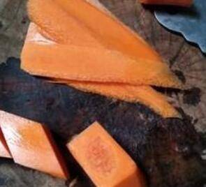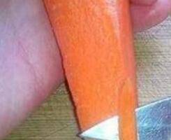 3、然后胡萝卜切口朝下,用刀竖着切薄片,菱形的胡萝卜片就出来了。