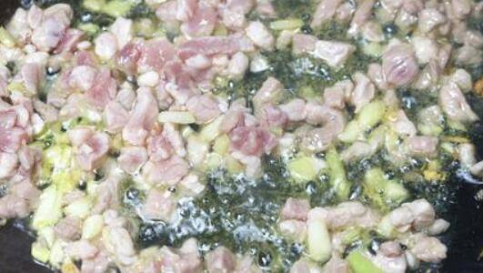 2、热锅凉油,倒入葱、姜、蒜末,小火炒出香味,倒入肉末,加入半勺料酒,快速翻炒均匀。