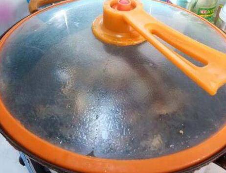 5、煎好后,加一小碗水,刚刚淹没鱼干即可。大火烧开后,加盖改小火焖3-5分钟。