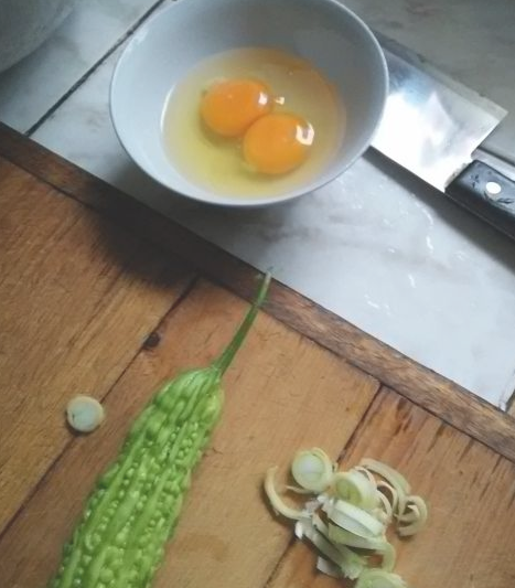 准备苦瓜、鸡蛋和葱。将苦瓜洗净,葱切成小片。