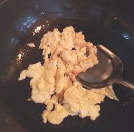 用铲子将鸡蛋搅成均匀的小碎块。炒熟后,先盛入盘中。