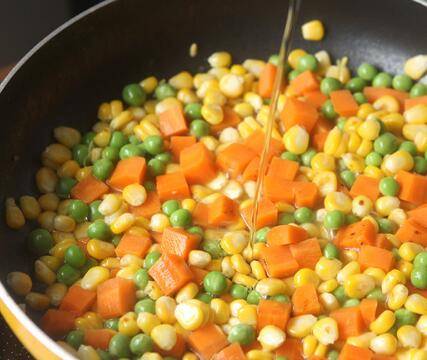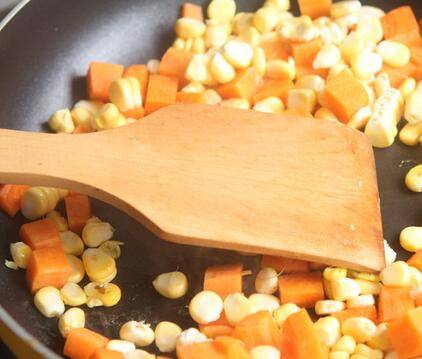 锅内热油后倒入胡萝卜和玉米翻炒片刻。