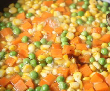 待煮到只剩下少量水,玉米粒和青豆,胡萝卜都熟了后,倒入蚝油翻炒均匀。
