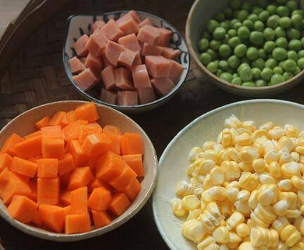 玉米、胡萝卜、青豆都比较难熟,要先煮熟再炒,此菜材料也可以根据自己喜欢的替换一些其他材料,例如青瓜、土豆,火腿换成鸡肉,瘦肉都行。