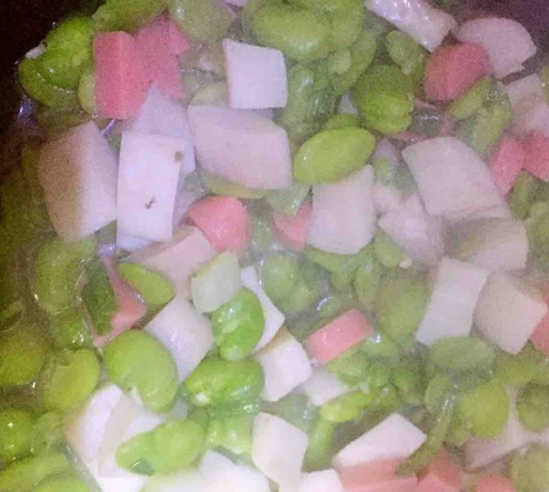 准备食材:杏鲍菇1根、蚕豆1小碗、火腿肠1根、盐、酱油、植物油适量。