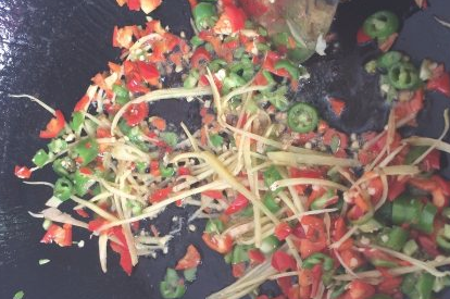 准备葱姜蒜、线椒、红椒,先将所有配料炒一下;