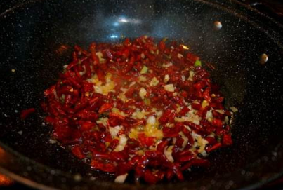 4、锅入油,小火炒香花椒和干红椒。